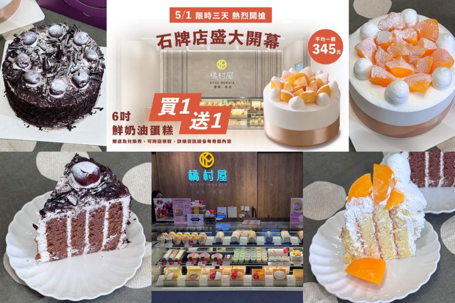 什麼!橘村屋的鮮奶油蛋糕居然買一送一,這次橘村屋特別選在北投石牌開門市,而且位於石牌捷運站1號出口步行1分鐘真的有夠方便,2025/5/1 ~ 2025/5/3 (限時三天)居然蛋糕買一送一太划算!這樣算下來平均一顆6吋鮮奶油蛋糕僅需345元,真的是一定要衝的啦~