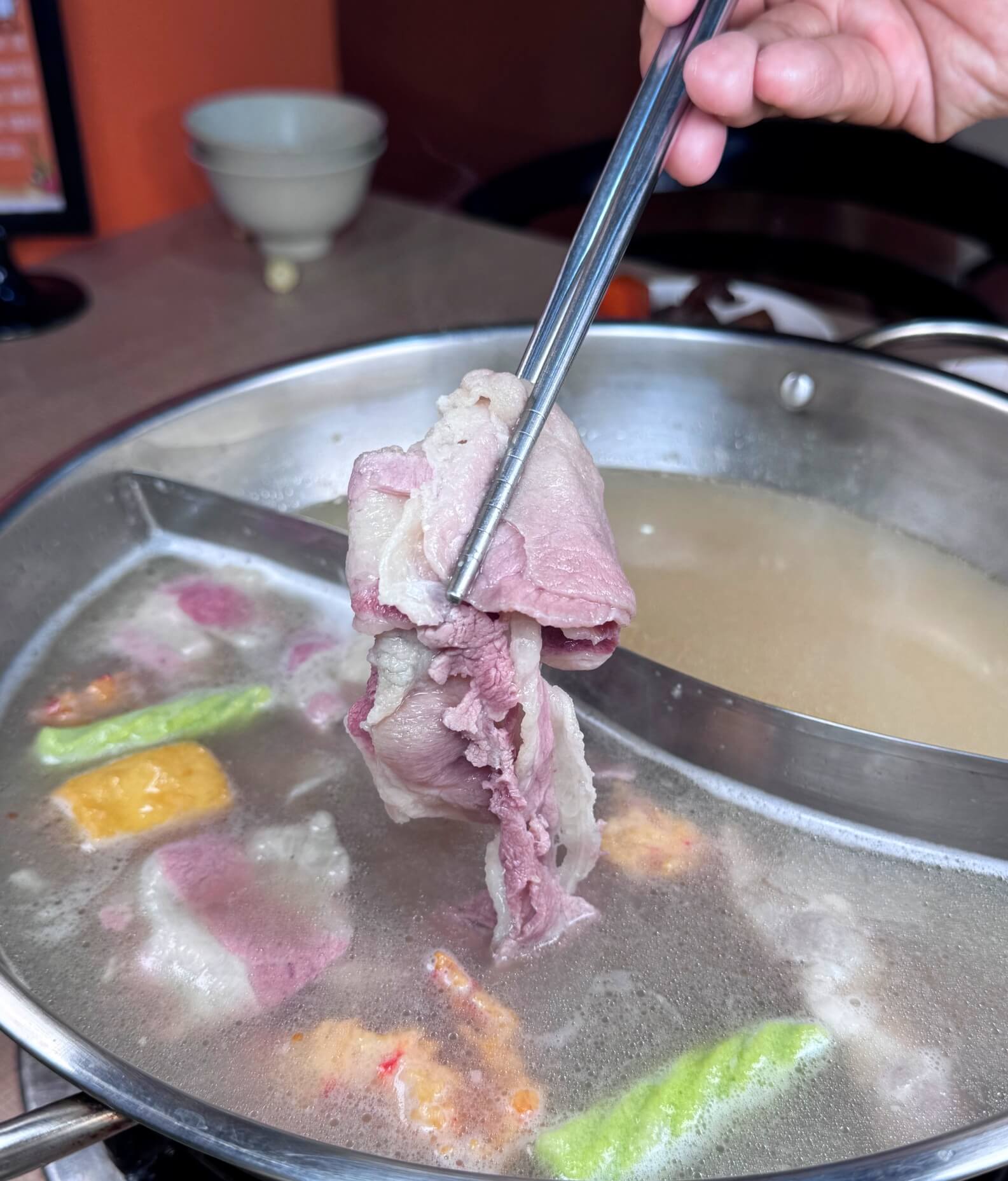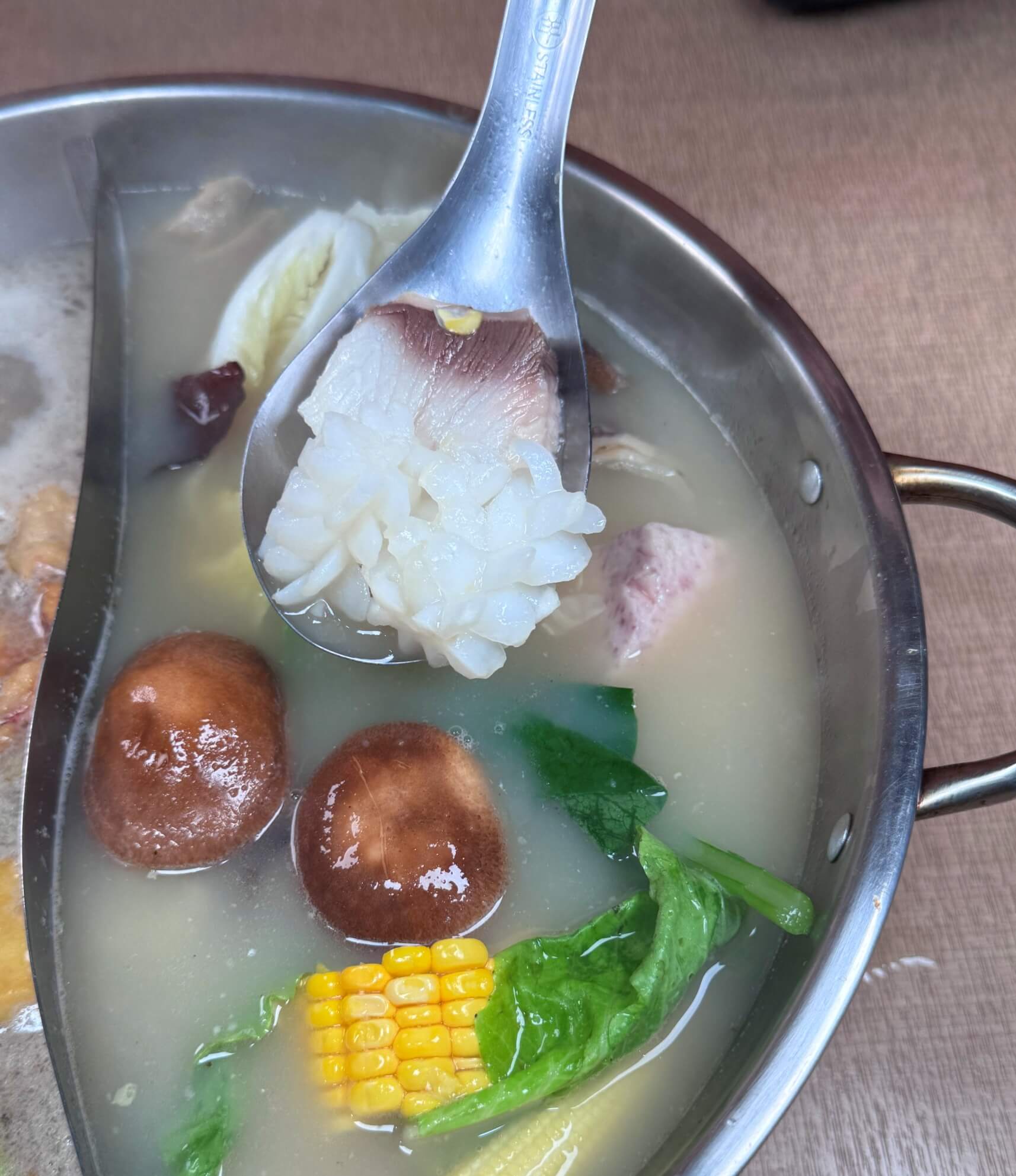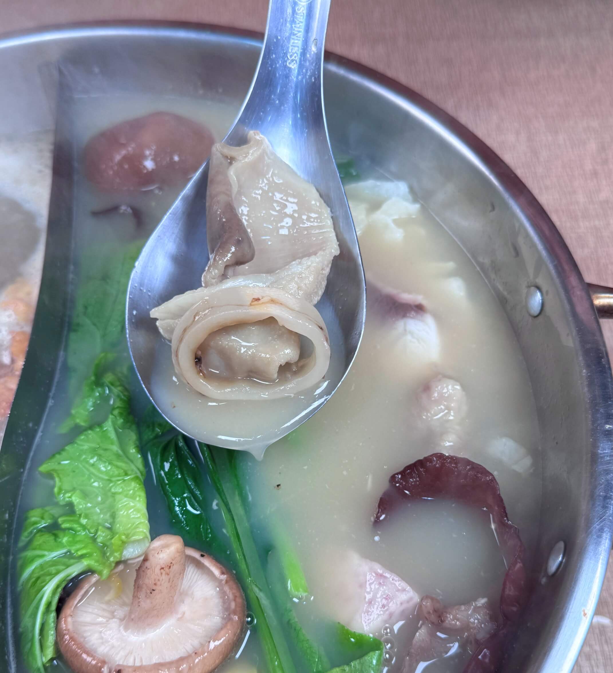 把肉放到干貝香菇雞湯涮煮可以吃到香菇雞湯的香氣,最後有干貝的尾韻,拿來涮肉真的好過癮!