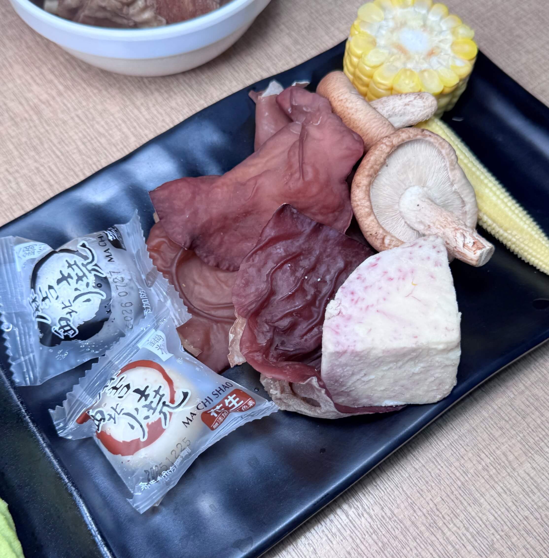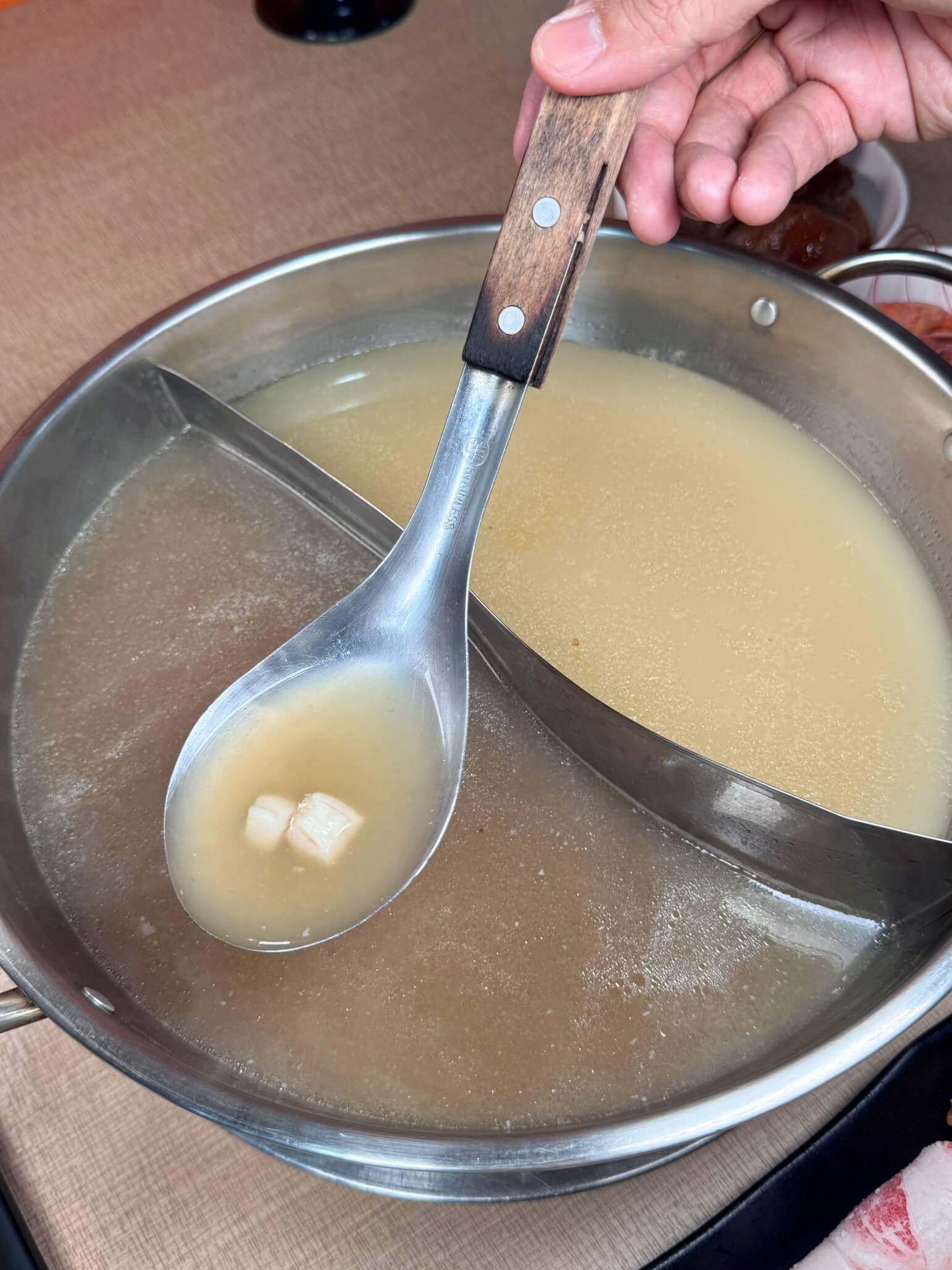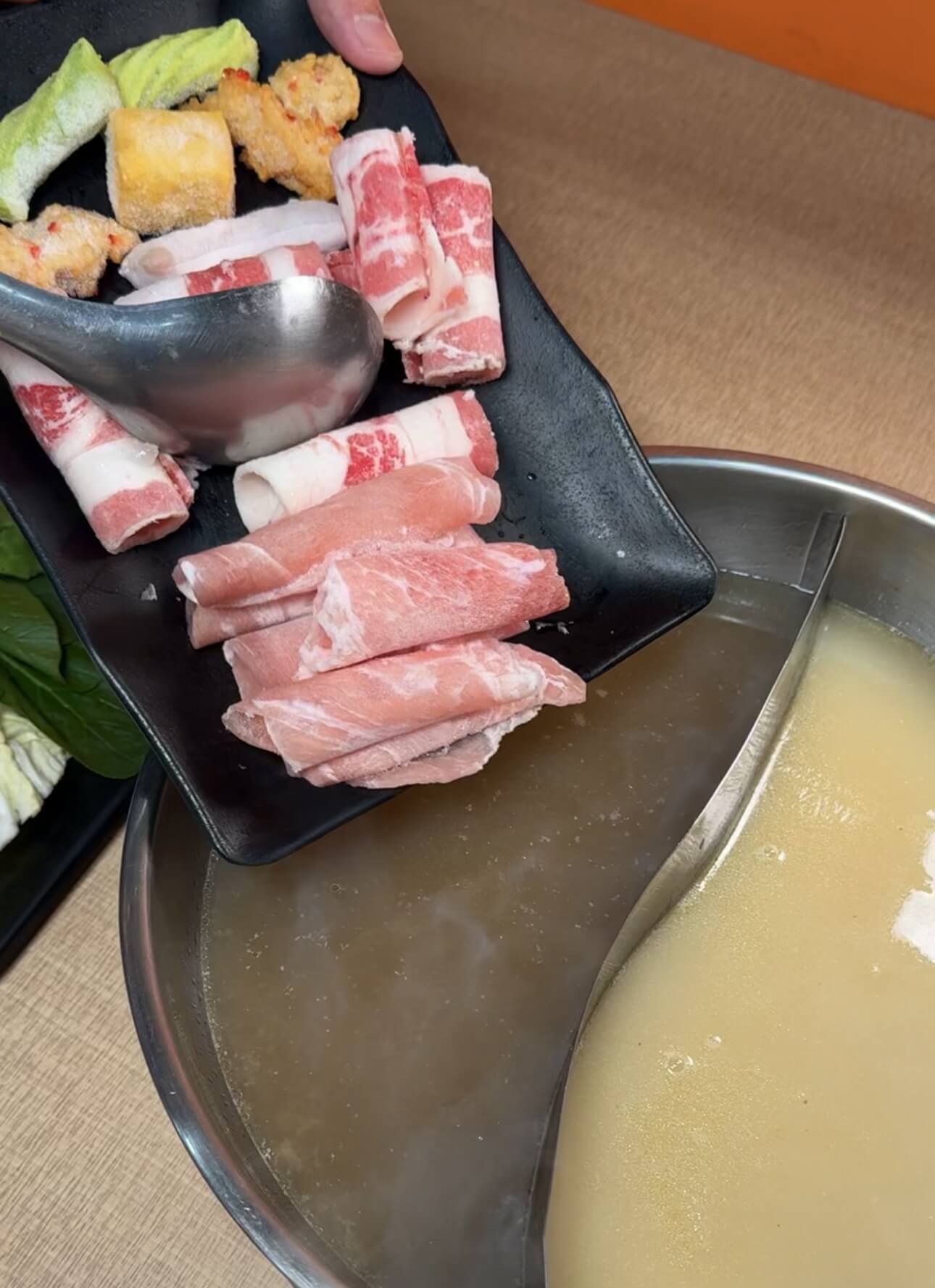 把肉放到干貝香菇雞湯涮煮可以吃到香菇雞湯的香氣,最後有干貝的尾韻,拿來涮肉真的好過癮!