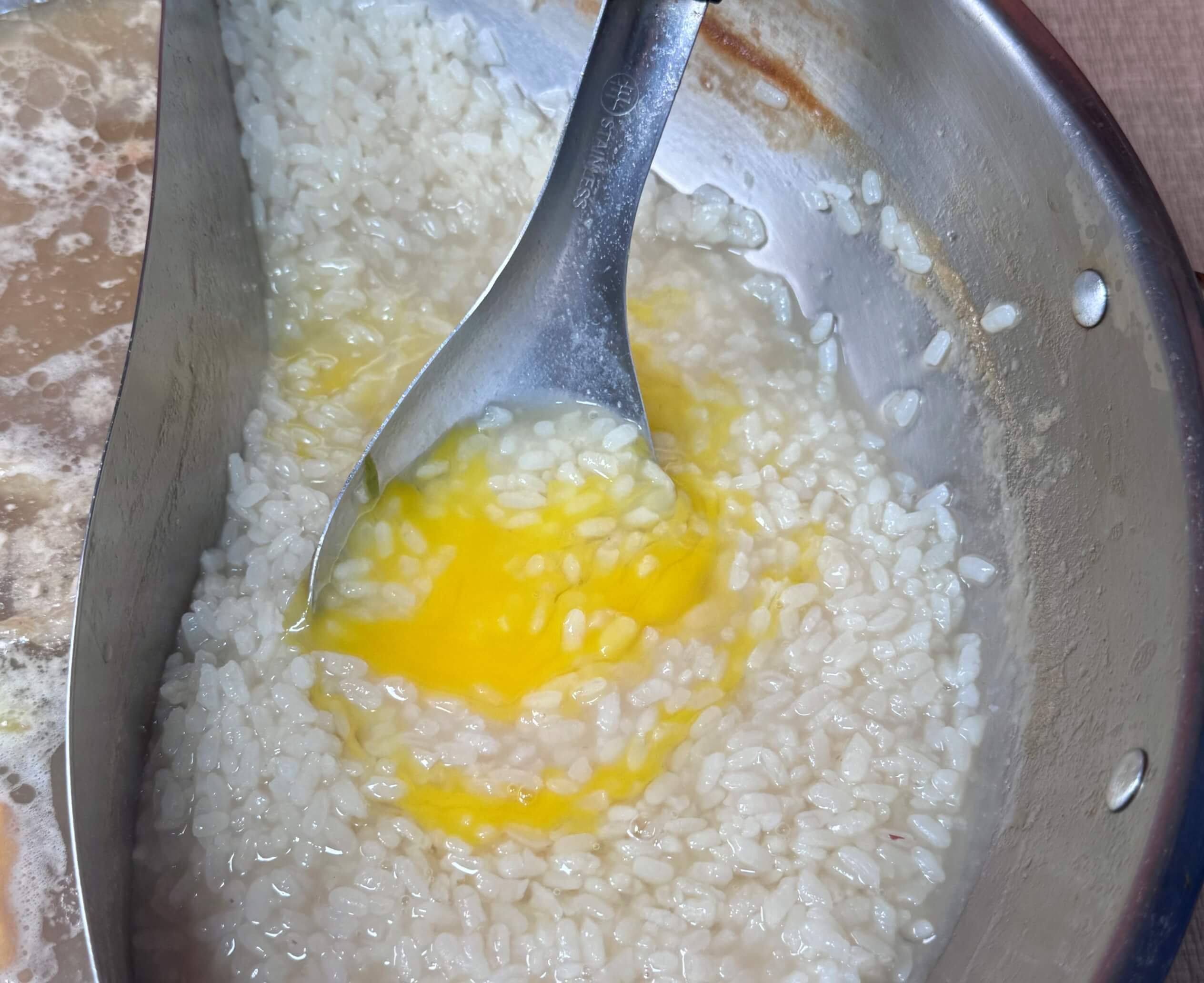 先在金·醇香雞湯的鍋底裡面加入白飯,然後再打上一顆蛋慢慢地攪拌來吸收金·醇香雞湯的精華。