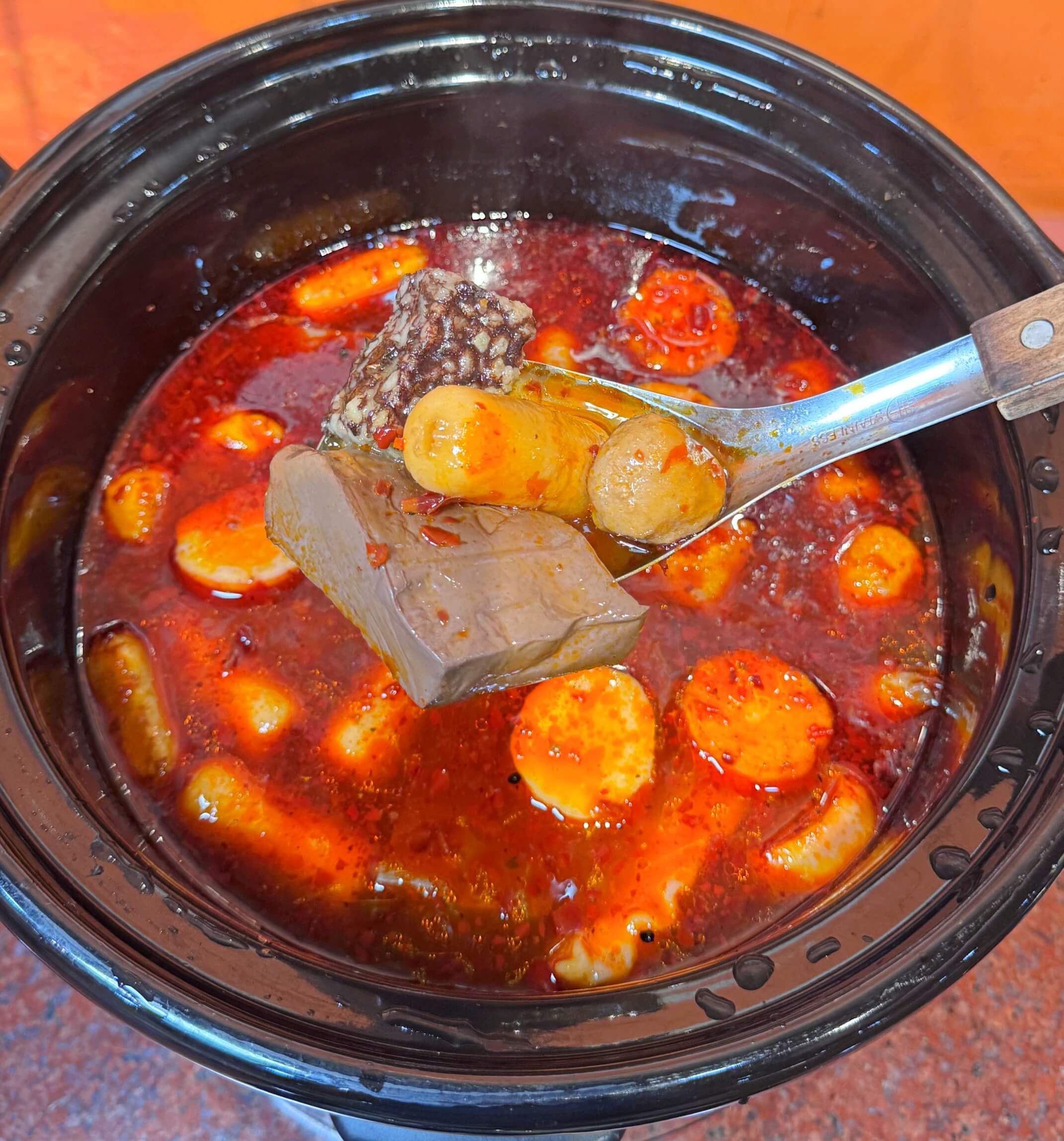 這裡面有超多的麻辣好料!像是米血、魚蛋和鴨血,喜歡吃辣的朋友一定要吃很多啦!